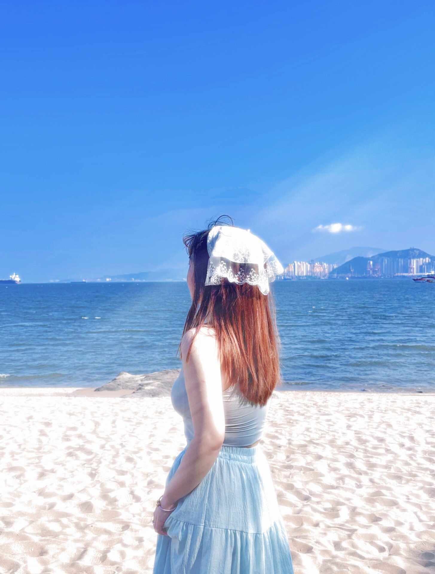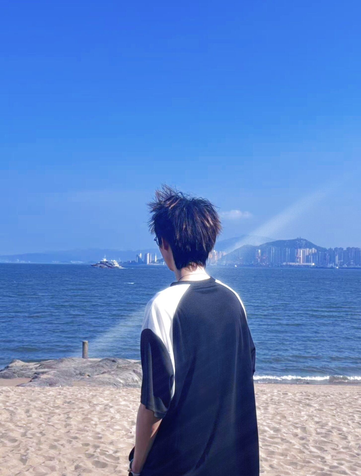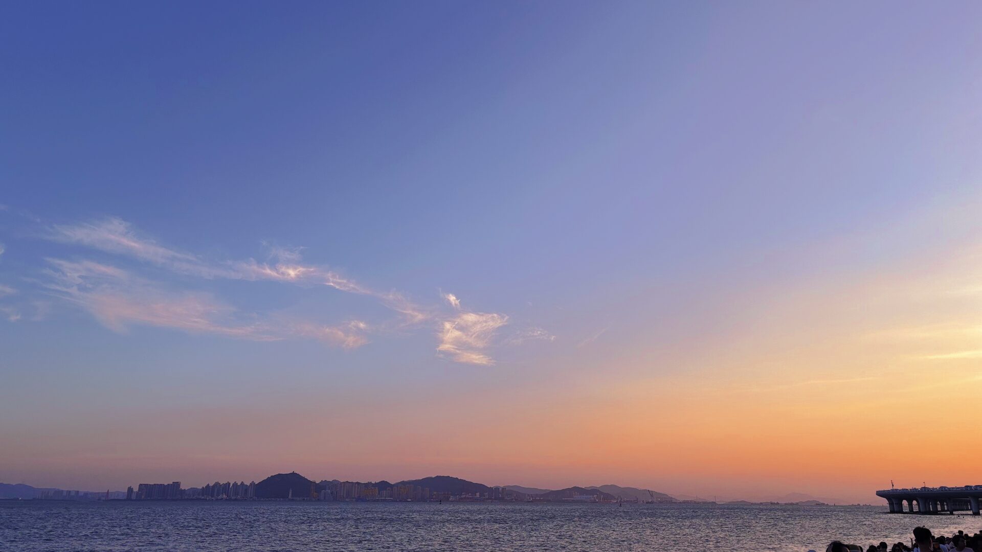 This photo was taken at sunset on Gulangyu Island in Xiamen. The sky gently fades from a deep twilight blue to a soft, glowing orange, like a watercolor painting unfolding across the horizon. Distant hills and the city skyline rest quietly beneath the sky’s warm embrace, while the sea below shimmers with scattered light, whispering stories of the day’s end.